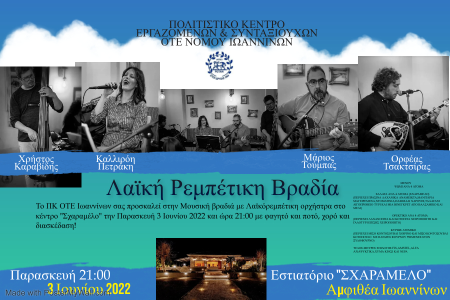 Μουσική βραδιά με λαϊκορεμπέτικη ορχήστρα στο εστιατόριο ¨Σχαραμέλο¨ στην Αμφιθέα Ιωαννίνων τις 3-6-2022.